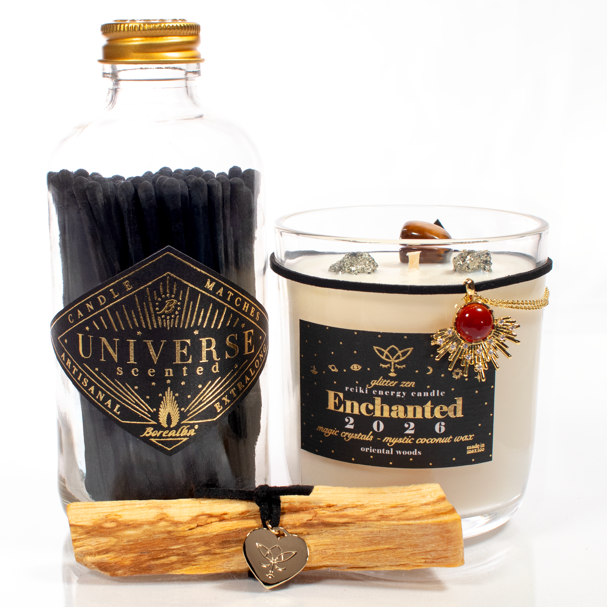1. Vela ENCHANTED 2026 de Glitter Zen: Intención: LOGRAR TUS PROPÓSITOS. Con dije de ave fénix y cadena con baño de oro, cuarzos energéticos sobre cera orgánica de coco, e intencionada en un ritual de Reiki. Aroma Oriental Woods. Cont. 8oz.