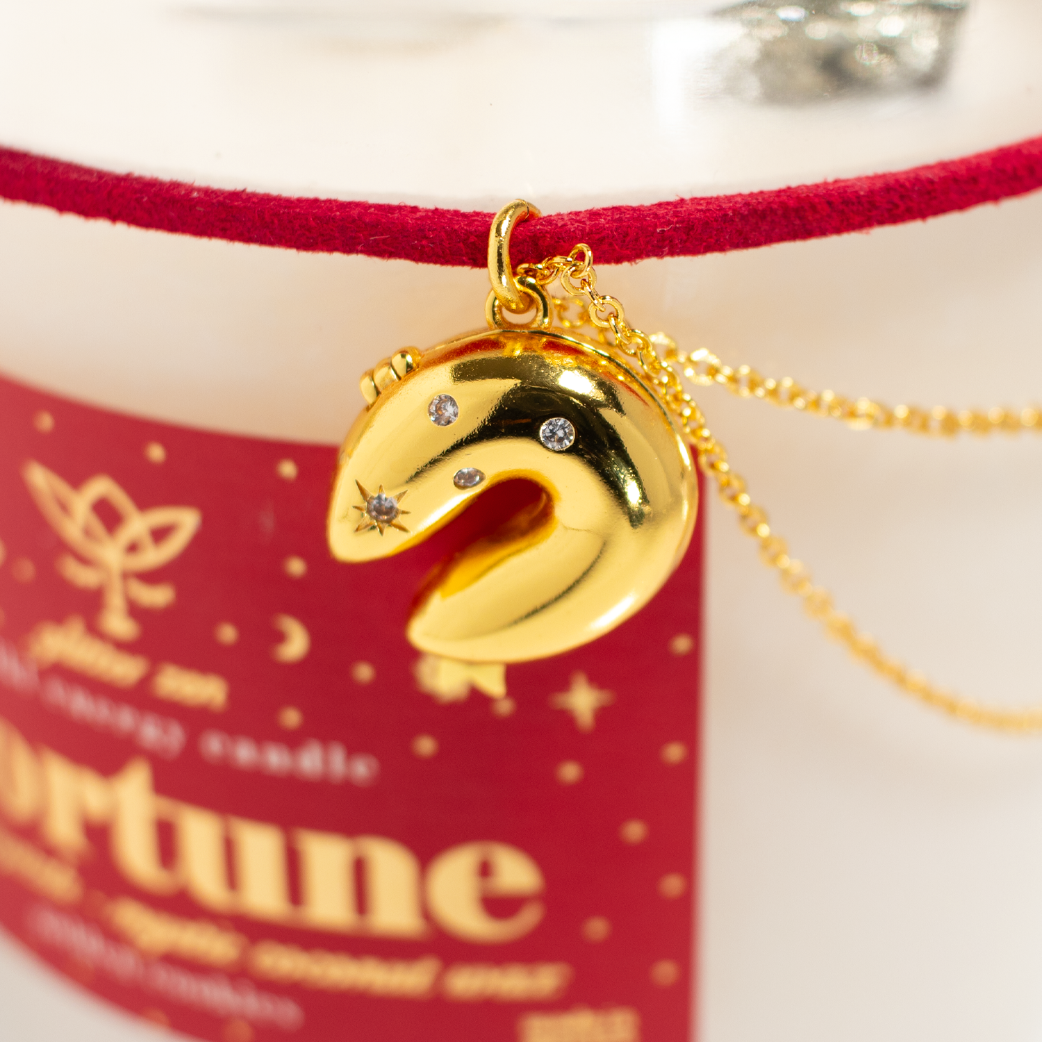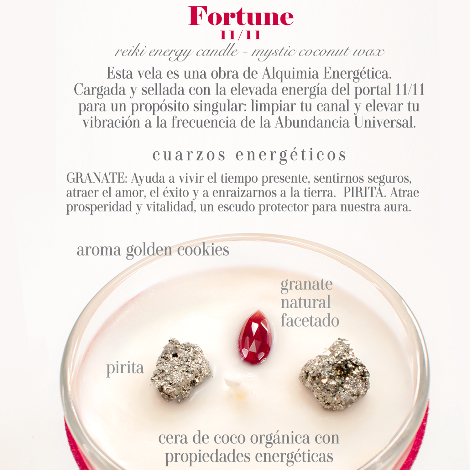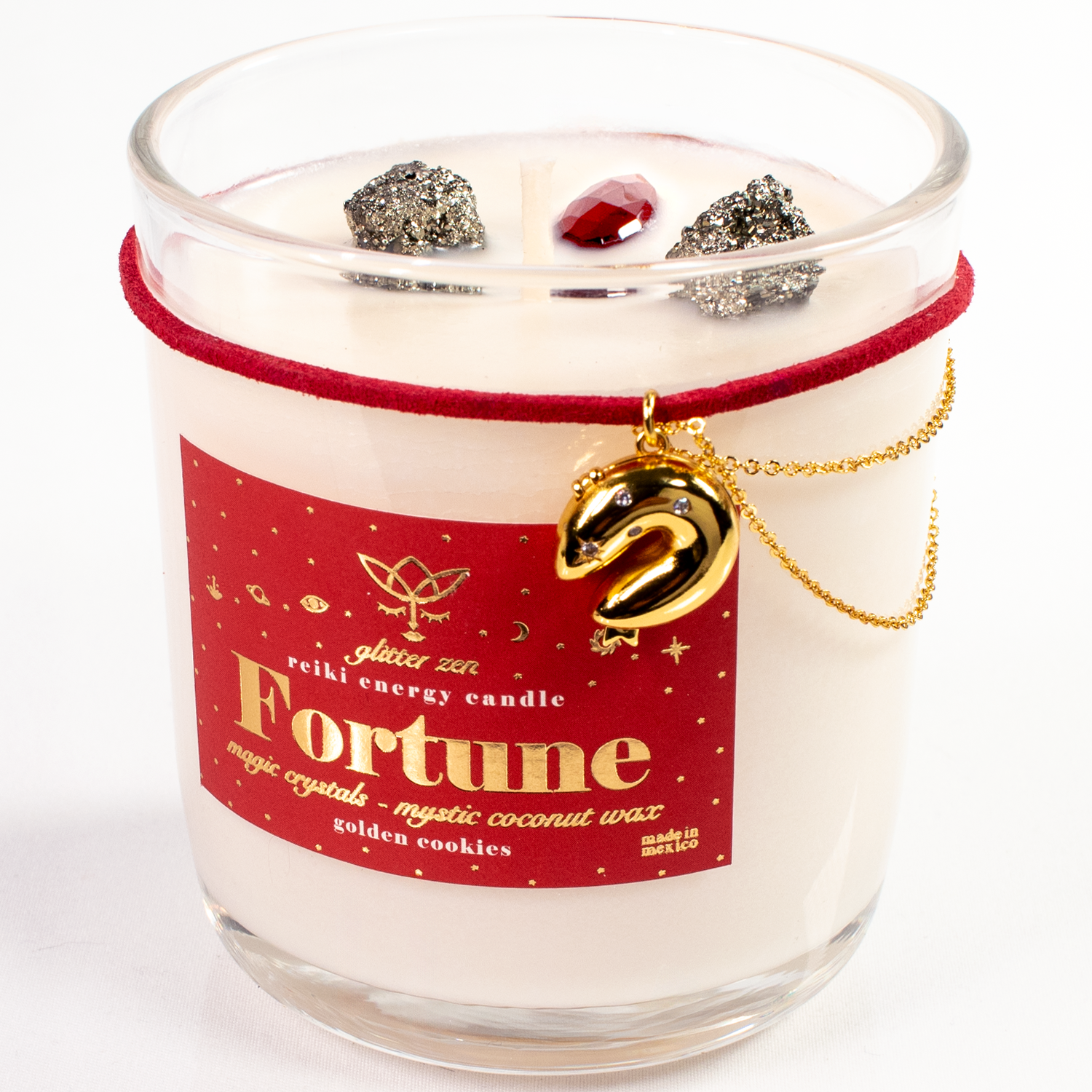 Vela de Intención FORTUNE 8oz: FORTUNA Y BUENA SUERTE, Dije y cadena con baño de oro, Reiki, Cuarzos, aroma GOLDEN COOKIES | Glitter Zen