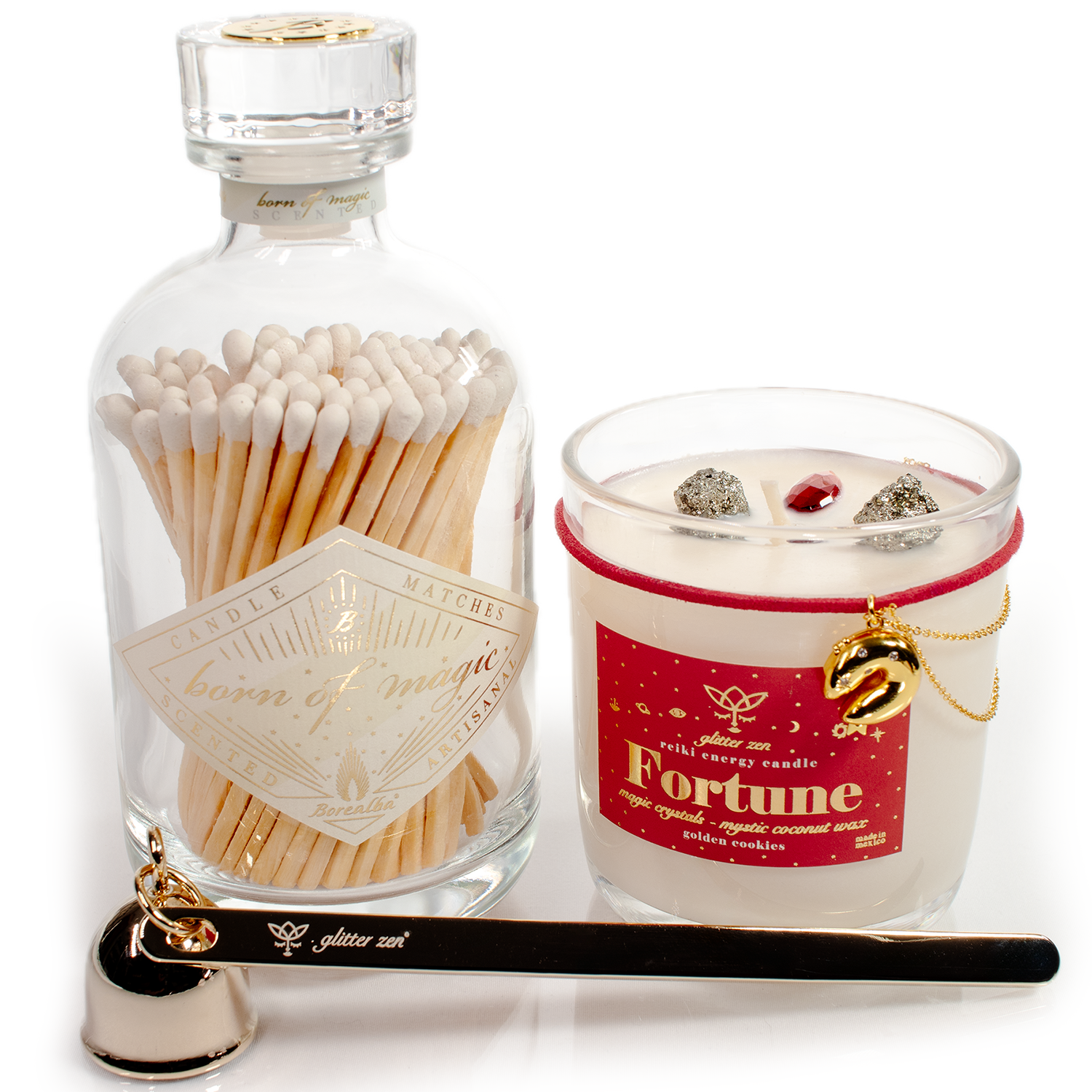 Incluye Vela FORTUNE 11:11, Luces aromatizadas Born of magic y Apagavelas Heavy Deluxe.